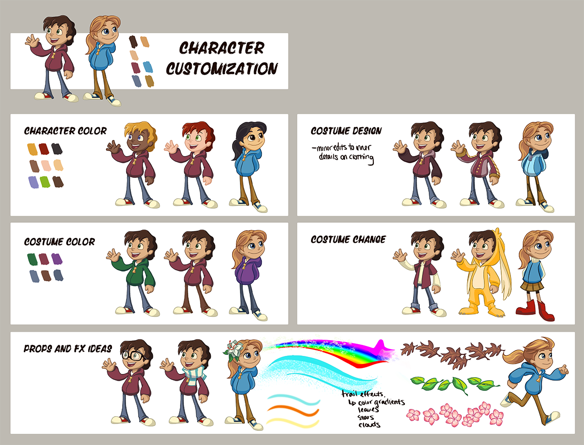 Concept design, illustration, and graphic design done for the endless runner, Buddy & Me. Main focus was on support using existing art, creating new illustration components, and designing the girl player character.